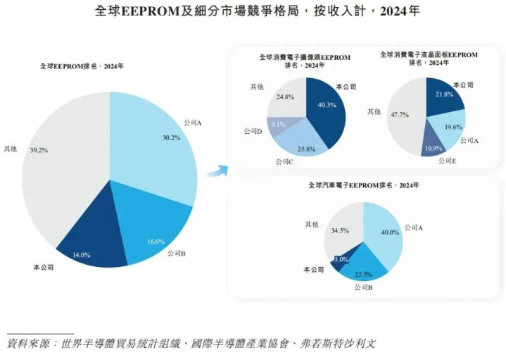 按2024年收入计,在天下EEPROM阛阓,公司是天下名挨次三的EEPROM供应商和最大的EEPROM中国供应商。在花费电子EEPROM板块,公司在花费电子录像头模块EEPROM及花费电子液晶面板EEPROM阛阓亦离别以40.3%和21.8%的份额名次天下第一。