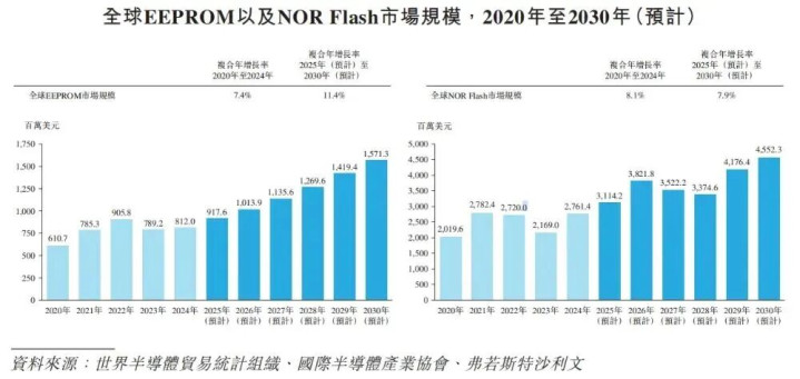 字据弗若斯特沙利文(Frost&Sullivan)评释,EEPROM芯片阛阓领域从2020年的610.7百万好意思元增长至2024年的812.0百万好意思元,复合年增长率为7.4%。NORFlash芯片阛阓领域从2020年的2,019.6百万好意思元增长至2024年的2,761.4百万好意思元,复合年增长率为8.1%。