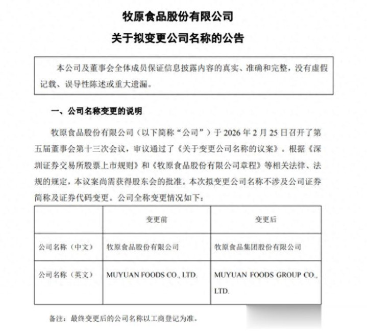 春节刚过,2月25日,A股生猪孳生龙头牧原股份(002714.SZ)发布公告称,公司第五届董事会第十三次会议已审议通过改名议案,拟将公司全称由“牧原食物股份有限公司”变更为“牧原食物集团股份有限公司”,英文称号同步由“MUYUAN FOODS CO., LTD.”变更为“MUYUAN FOODS GROUP CO., LTD.”。本次改名不触及证券简称及代码变更,关连议案尚需股东会批准,最终称号以工商登记为准。
