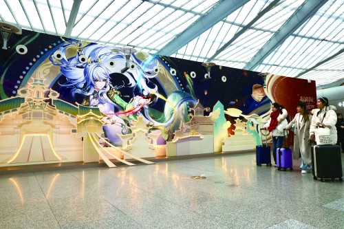 护栏玻璃上贴着致密的二次元立场窗花,立柱灯箱印有灵动超逸的游戏脚色,巨幅的主题墙绘前聚满了拍照眷恋的年青东说念主……传统春运的归家场景,与数字世界的玄幻念念象在此刻交汇,碰撞出别样的年味与新意。
