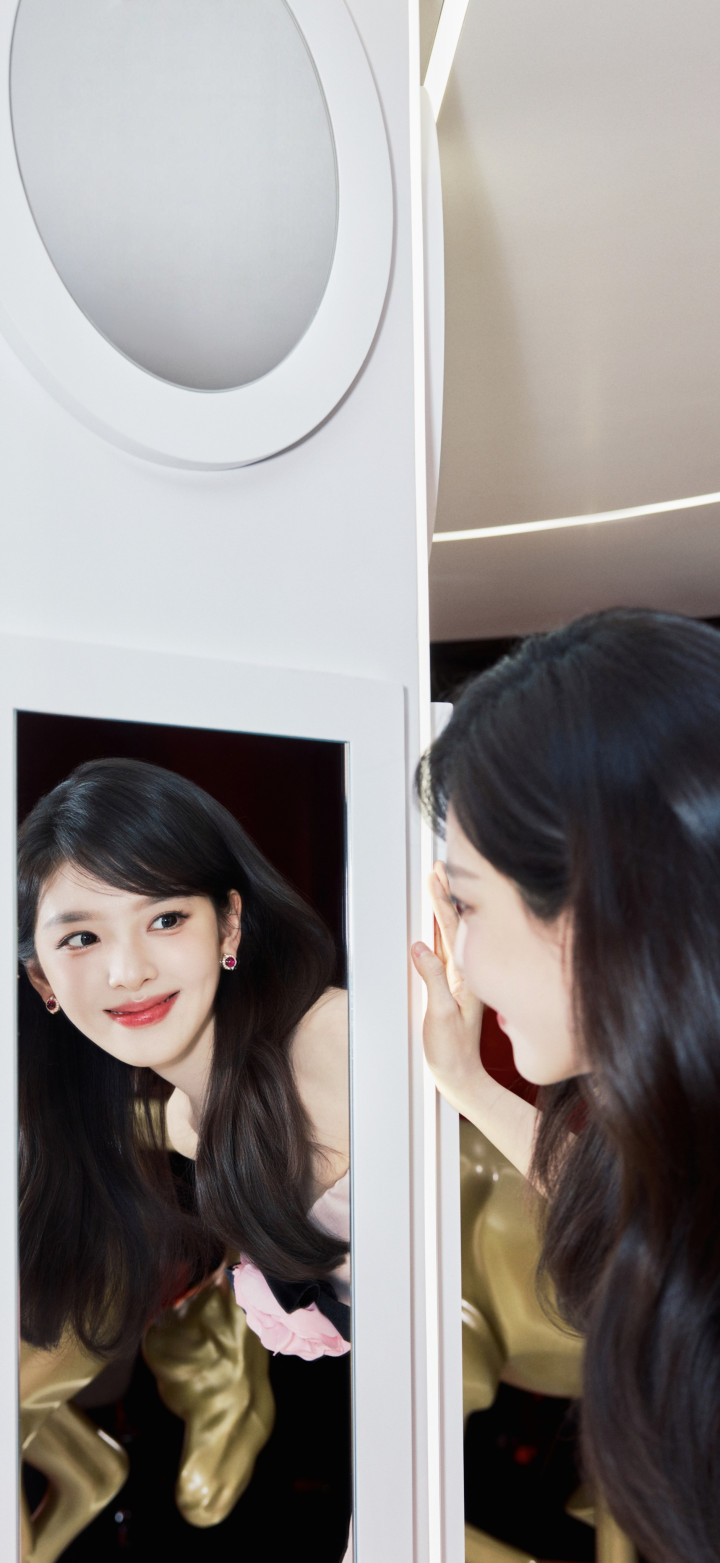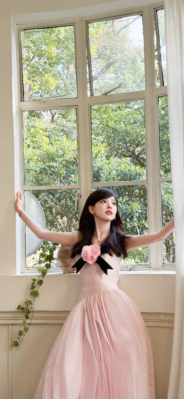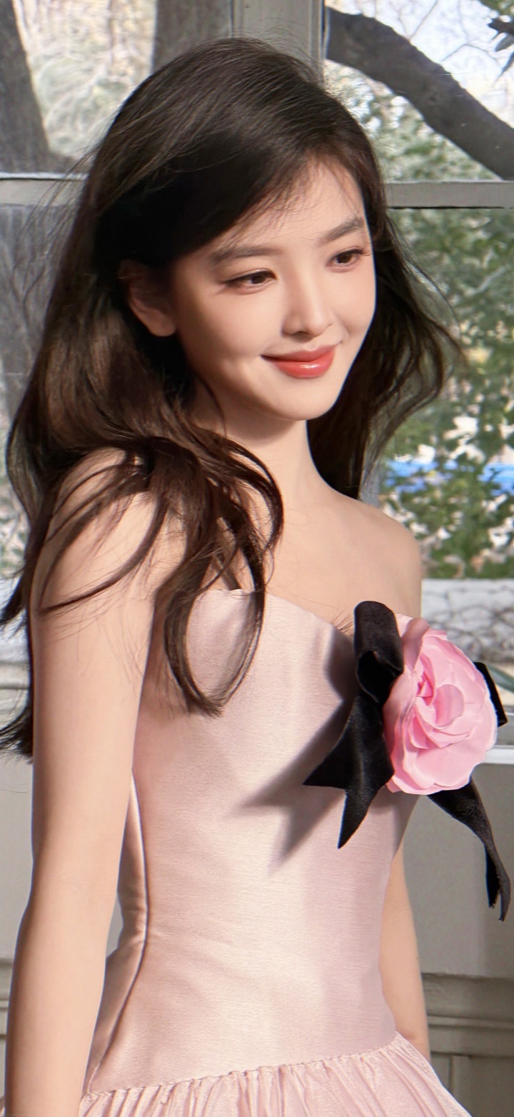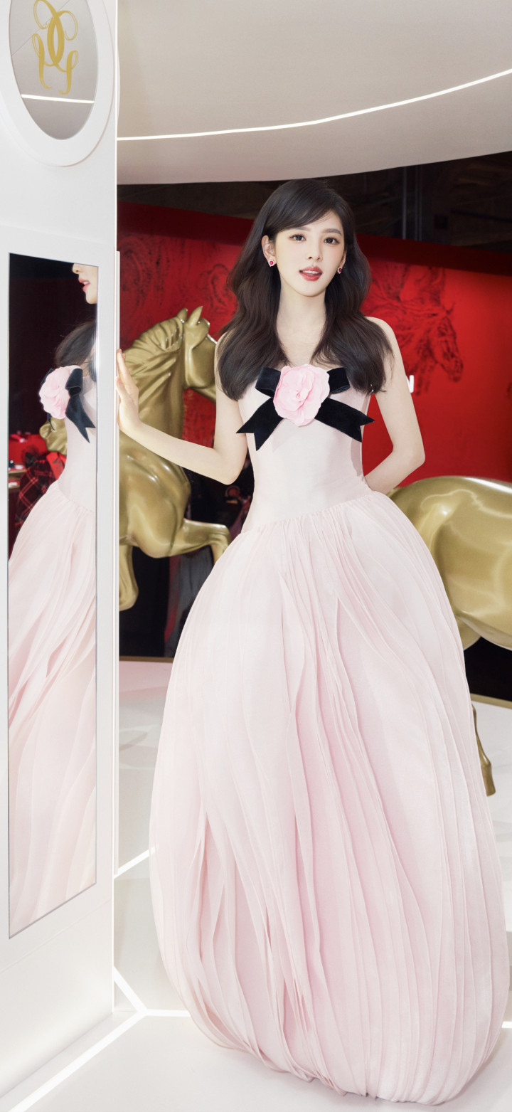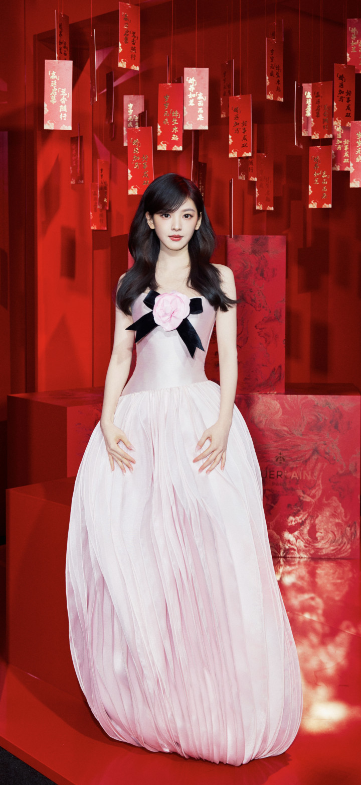 章若楠身穿定制粉色抹胸长裙,左胸点缀直径20厘米的薄荷绿立体绢花,花瓣镶碎钻,搭配宝格丽珠宝与蓬松鬈发,呼应品牌“当然好意思学”的主题。