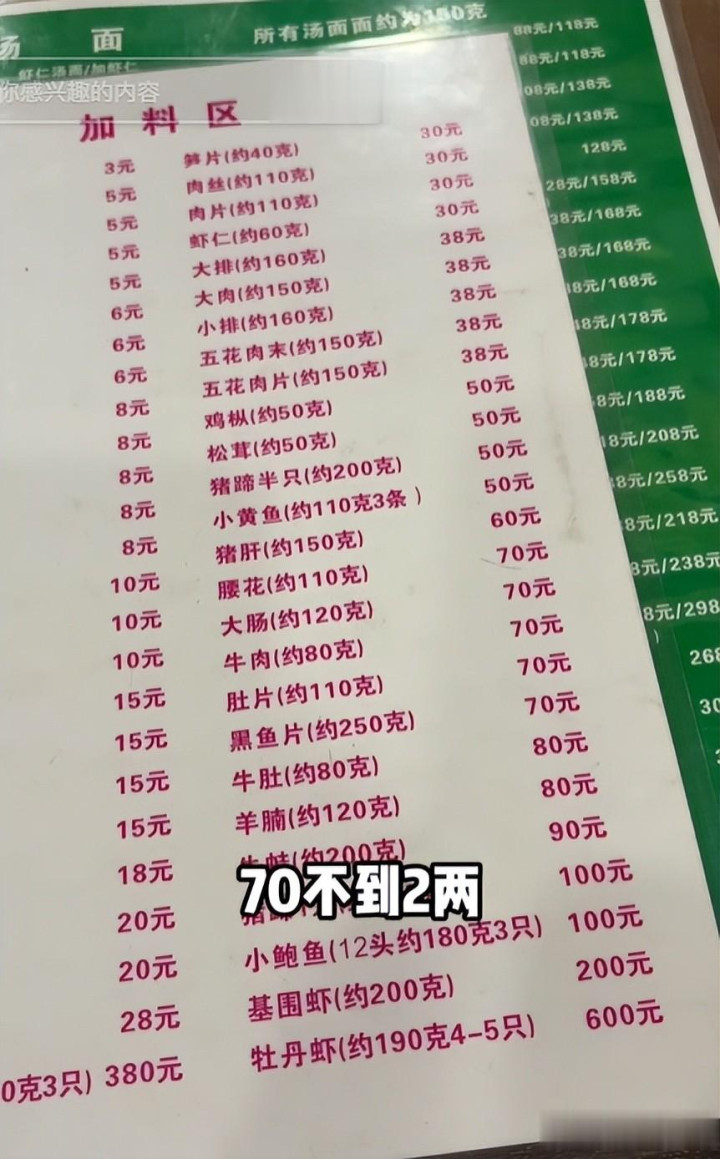 598元的面还能尽头加料,80克牛肉近70元,开云官方app下载二两牡丹虾4到5只就要600元,这么的加料价钱,比不少高端海鲜馆还要离谱。