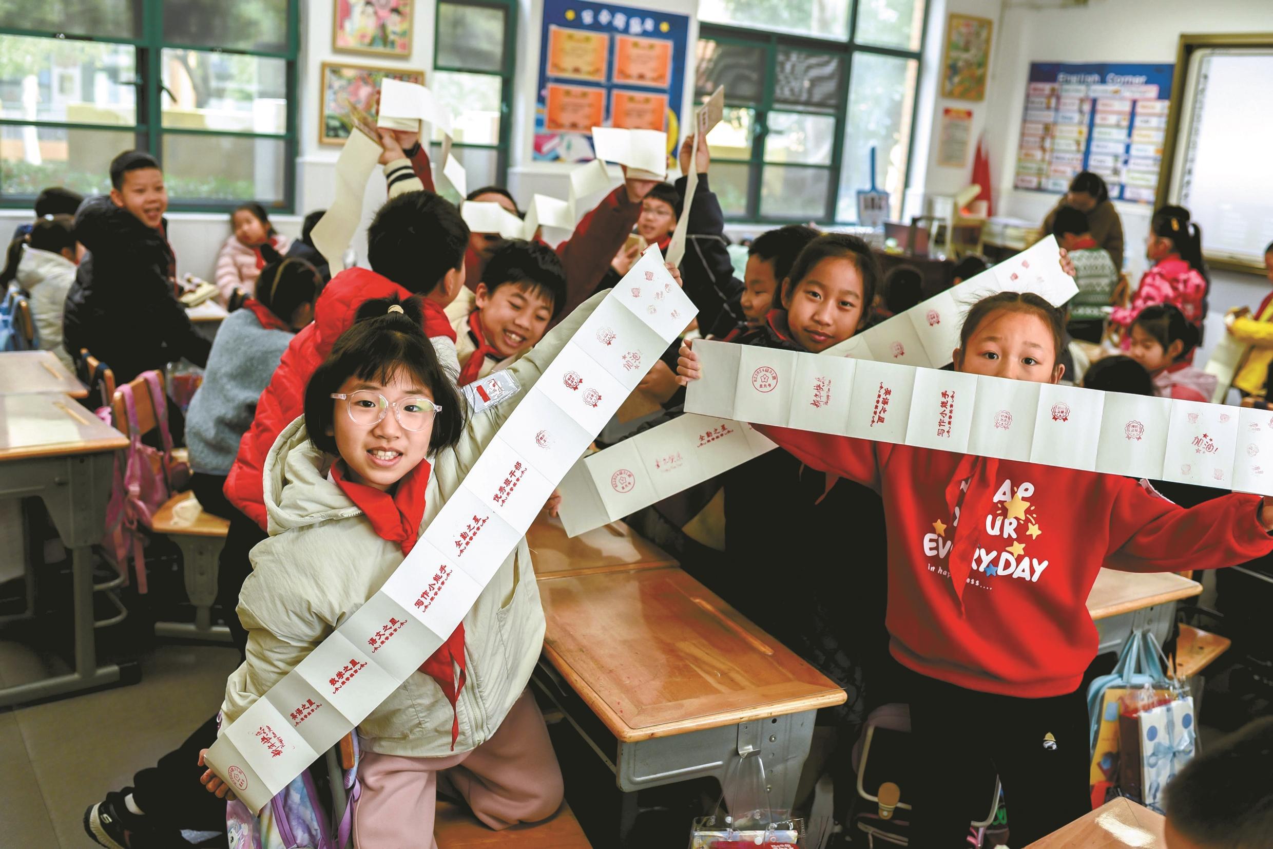“当年期末是发奖状,当今是咱们我方敲章、蚁集钤记!”宁波市惠贞书院小学部201班的教室里,举行了一场别开生面的寒假休学式。